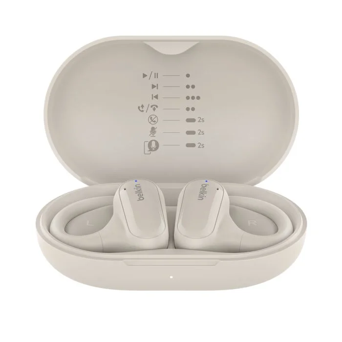 - Open-ear design features solid bass response while allowing sound from surroundings to come through