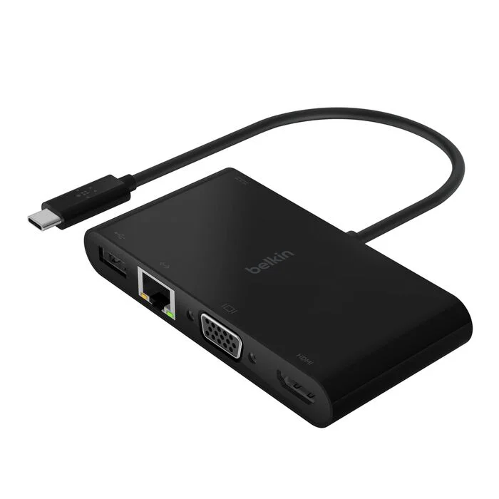 - Multi-port adapter with USB-A 3.0, VGA, and 4K HDMI ports